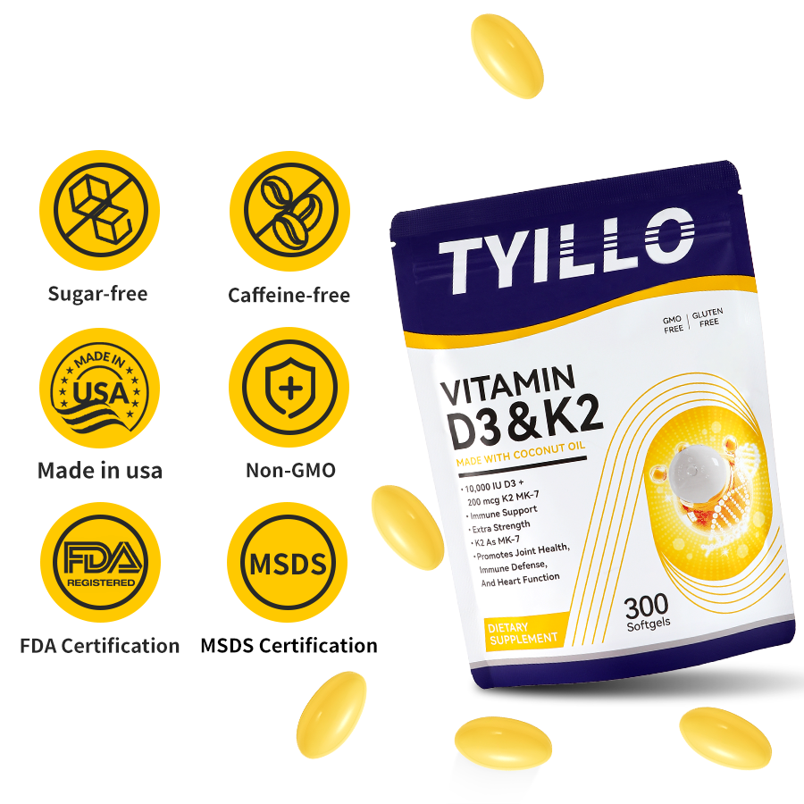 - Quality and safety: Tyillo Coconut Oil Vitamin D3K2 Soft Capsules are produced in the United States and have obtained FDA, GMP and other certifications. The products strictly control quality and pass the inspection of the third-party testing agency in the United States, just to protect your health.
