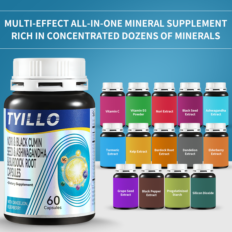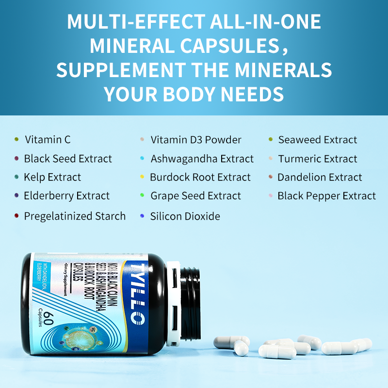 - Multi-Functional: Tyillo Seaweed Black Seed Ashwagandha Burdock Root Capsules are rich in fourteen nutritional components, effectively supplementing the daily required minerals and vitamins, and regulating overall health.